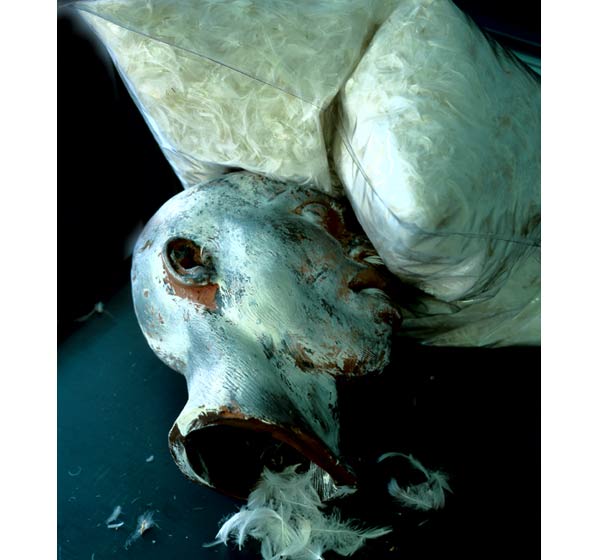 2001, Terrakotta, Federn, Polyethylen, Eisen, 40x60x60 cm